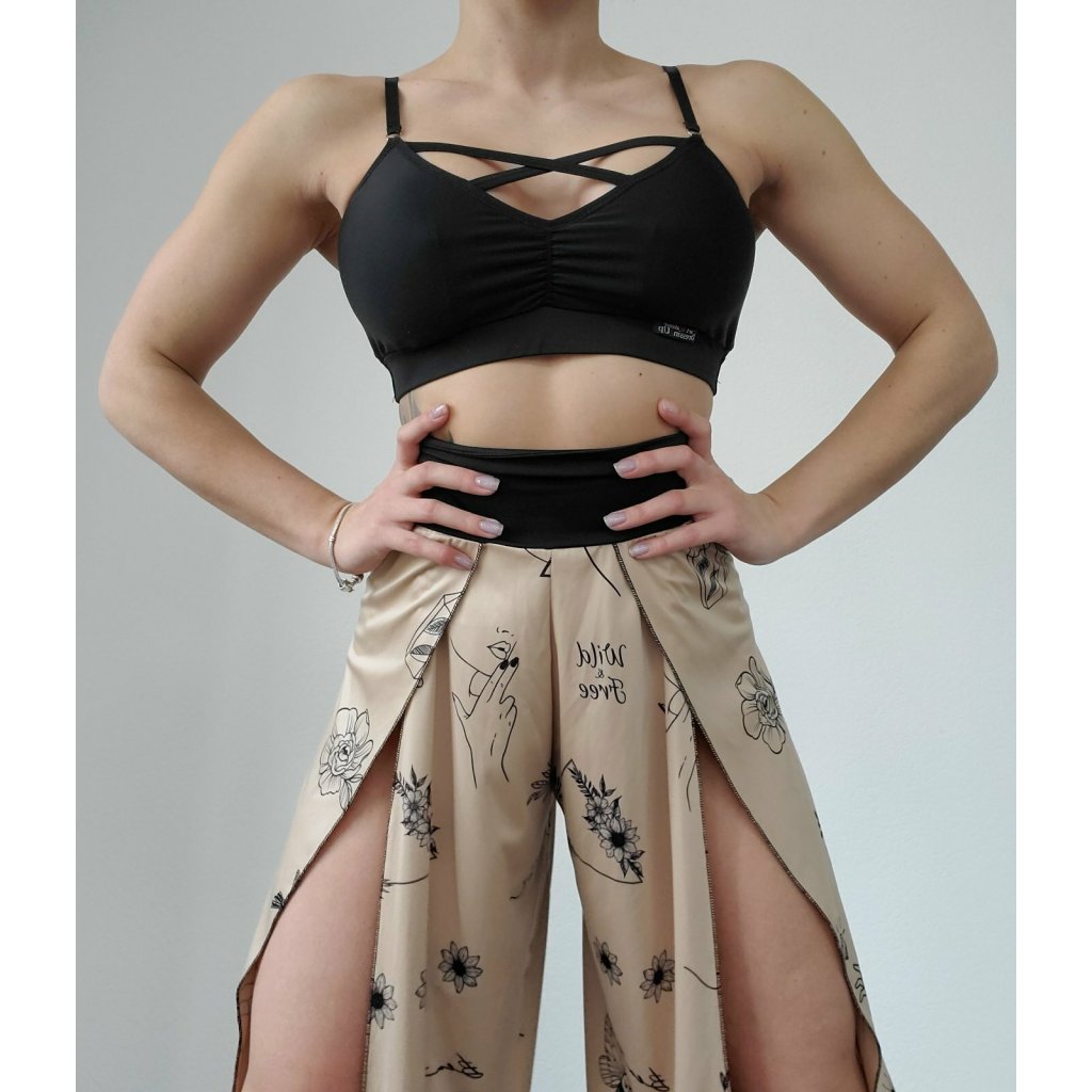 Culottes se širokými nohavicemi s hlubokými rozparky do pasu. Mají dvojitý pás se stahovacím efektem.